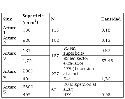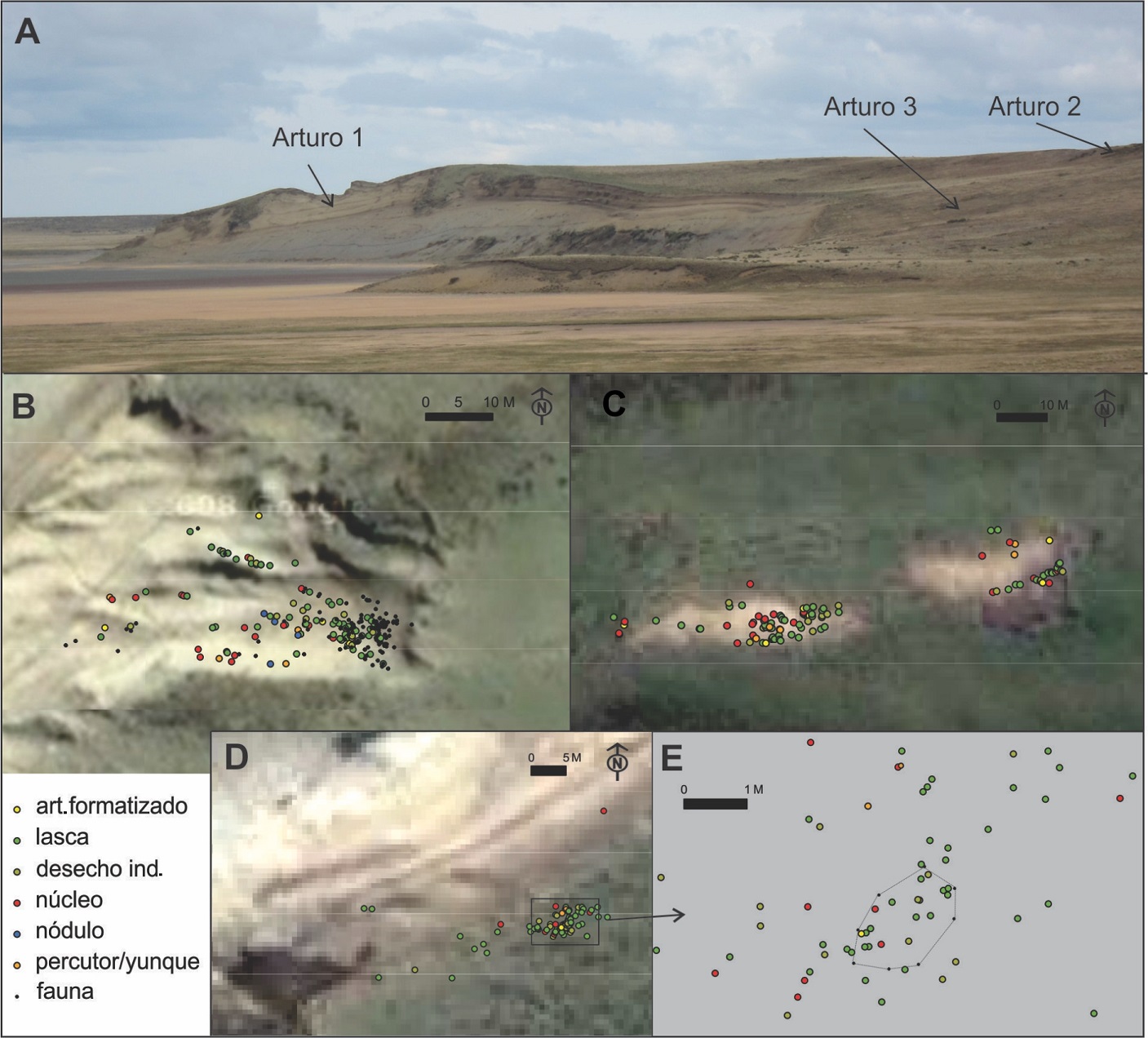 Los relevamientos intrasitio se realizaron con el sistema de Estación Total (Pentax R-326), y al momento de su recuperación se consignó la cara expuesta de cada artefacto. La superficie de los sitios se estimó siguiendo tres criterios, según el caso: (1) la totalidad del rasgo erosivo sobre el que se encontraron emplazados (Arturo 1 y 2), que fue prácticamente igual a la dispersión de materiales; (2) el área dentro de la cual se registraron artefactos (Arturo 3); y (3) el área total de la concentración de rodados en el fondo de la laguna (Arturo 4 y 5). Los valores de superficie se encuentran resumidos en la Tabla 1.