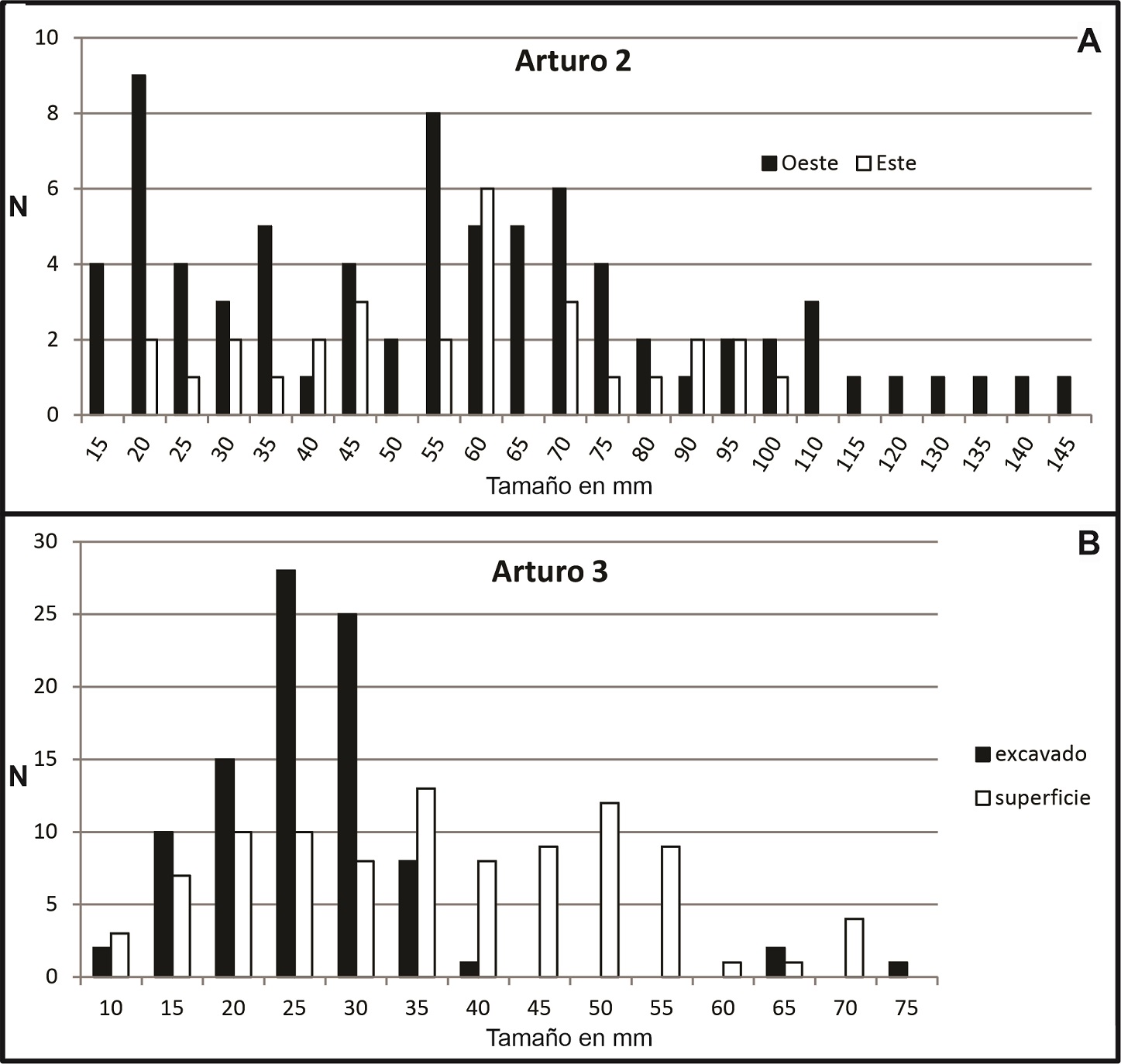 El área total delimitada para el sitio Arturo 3 es de 181 m., donde se registraron 187 artefactos (Figura 2D). Sin embargo, 92 de ellos fueron recuperados en una excavación subsuperficial en un área de 1,72 m. (Figura 2E). Es, hasta el momento, el único contexto de esta localidad en el que se recuperó material en estratigrafía. El área excavada permitió conocer la diferencia significativa entre los valores de densidad que regularmente observamos en los sitios de superficie de la estepa fueguina, apreciables en Arturo 1 y 2, y aquellos que podrían esperarse cuando los contextos aún no han quedado expuestos (Tabla 1). En relación con el tamaño, si comparamos los valores registrados en el conjunto de superficie y los artefactos recuperados en el área excavada, se evidencia una diferencia significativa (Figura 3B). El 87% de los materiales procedentes de la excavación tiene menos de 30 mm; en el conjunto de superficie, los artefactos con menos de 30 mm solo alcanzan el 40%.
