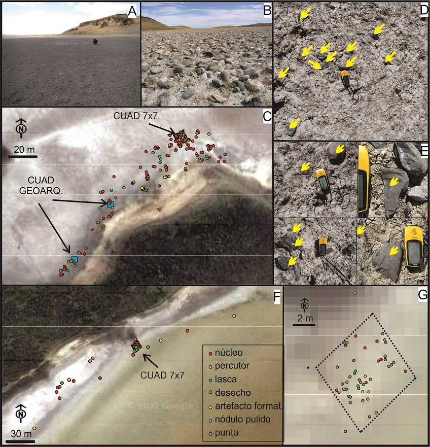 El sitio Arturo 5 también está emplazado en un depósito de rodados en el fondo de la laguna, pero vinculado a la costa norte. Este resulta más extendido y menos denso en comparación con Arturo 4. Tanto el relevamiento en terreno como el análisis de los artefactos recuperados están aún en etapas iniciales. En el área se registraron inicialmente 16 artefactos: ocho núcleos, cuatro lascas y cuatro raederas. Luego se realizó una recolección sistemática en un cuadro de 7 × 7 metros en un sector aledaño a los hallazgos mencionados, donde se recuperaron 47 artefactos (Figura 4G). A su vez, por fuera del cuadro, se recuperaron tres puntas líticas y una raedera. No fue posible establecer relaciones de ensamblaje en el conjunto, lo cual no permite a priori hablar de evidencias claras de talla o formatización en ese lugar.