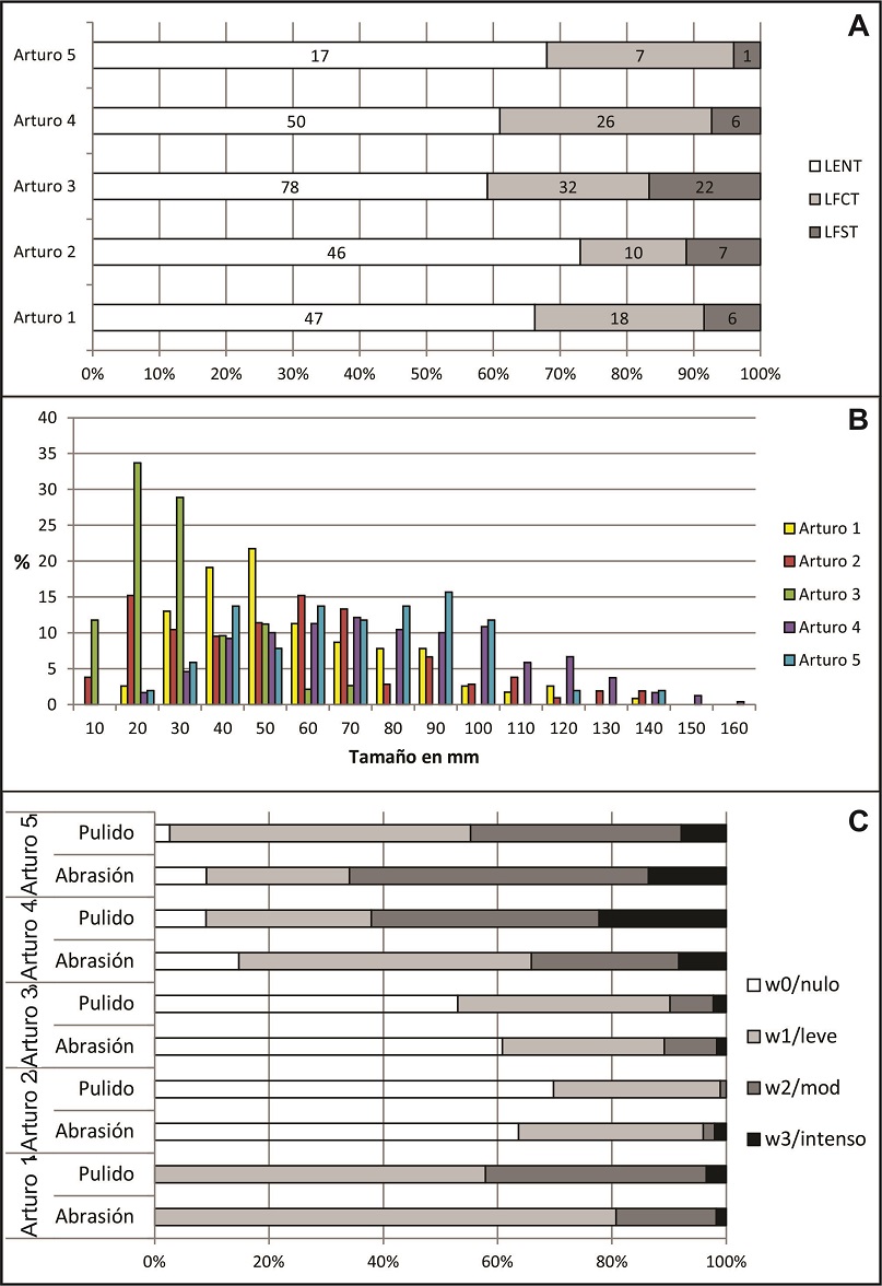 En relación con el análisis de la alteración en las superficies líticas, se observa que los conjuntos procedentes de los sitios Arturo 2 y 3 están menos afectados por abrasión y pulido (Figura 5C). Resulta esperable en Arturo 3, que fue interceptado con muy poco tiempo de exposición, pero es llamativo en Arturo 2, donde al menos una parte probablemente haya estado expuesta por más de seis años. Arturo 4 y 5, los conjuntos del fondo de la laguna, son los más alterados; la mayor incidencia de pulido en Arturo 4 fue considerada como posible indicador de la acción del agua en combinación con la arcilla del fondo lagunar (Oría et al., 2019). No se observaron diferencias significativas en el modo en que se manifiestan las alteraciones en las superficies líticas en los distintos tipos de materias primas presentes.