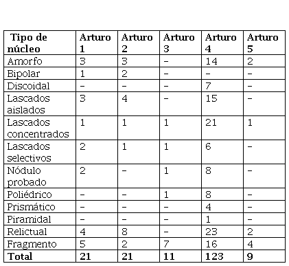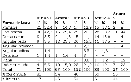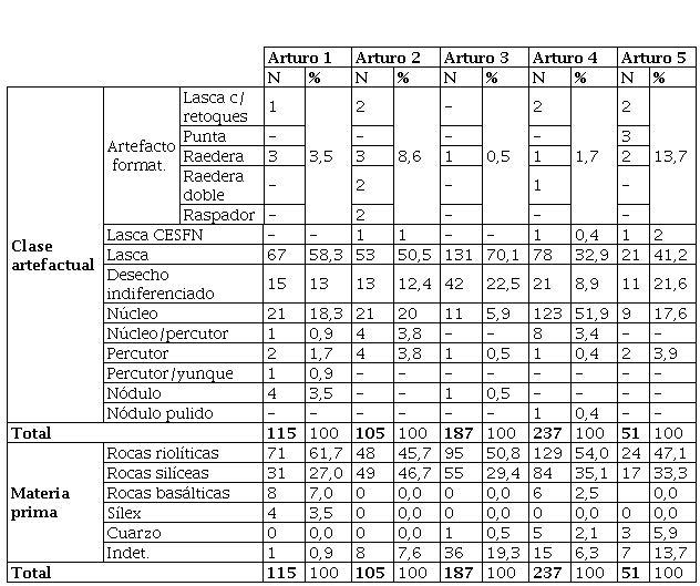 La composición artefactual de los conjuntos recuperados en los cinco sitios se resume en la Tabla 2. Las proporciones de las distintas clases artefactuales en los sitios Arturo 1 y 2 son semejantes, mientras que en Arturo 3, la frecuencia de lascas y desechos resulta elevada en relación con los otros conjuntos. La misma situación se observó en Arturo 4 respecto de la proporción de núcleos.
