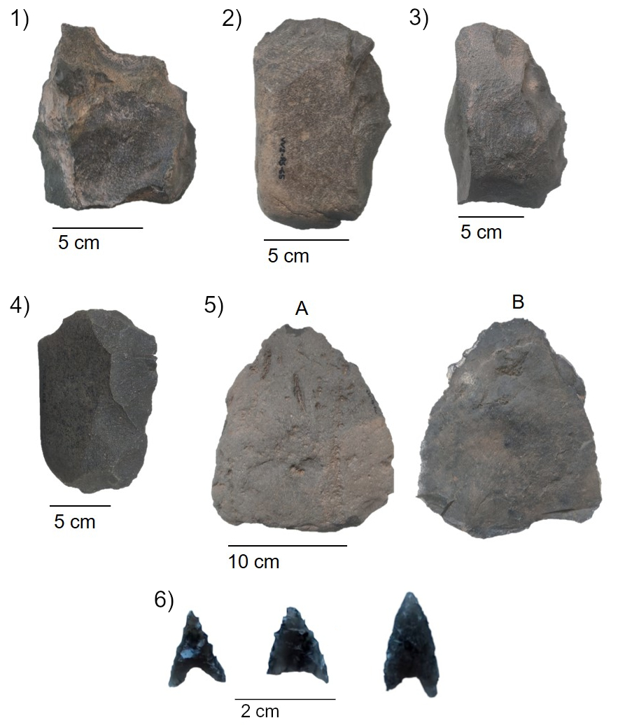 Artefactos formatizados clasificados como cepillos (1-4), pala y/o azada (5) en vista dorsal (A) y ventral (B), y puntas de proyectil (6).