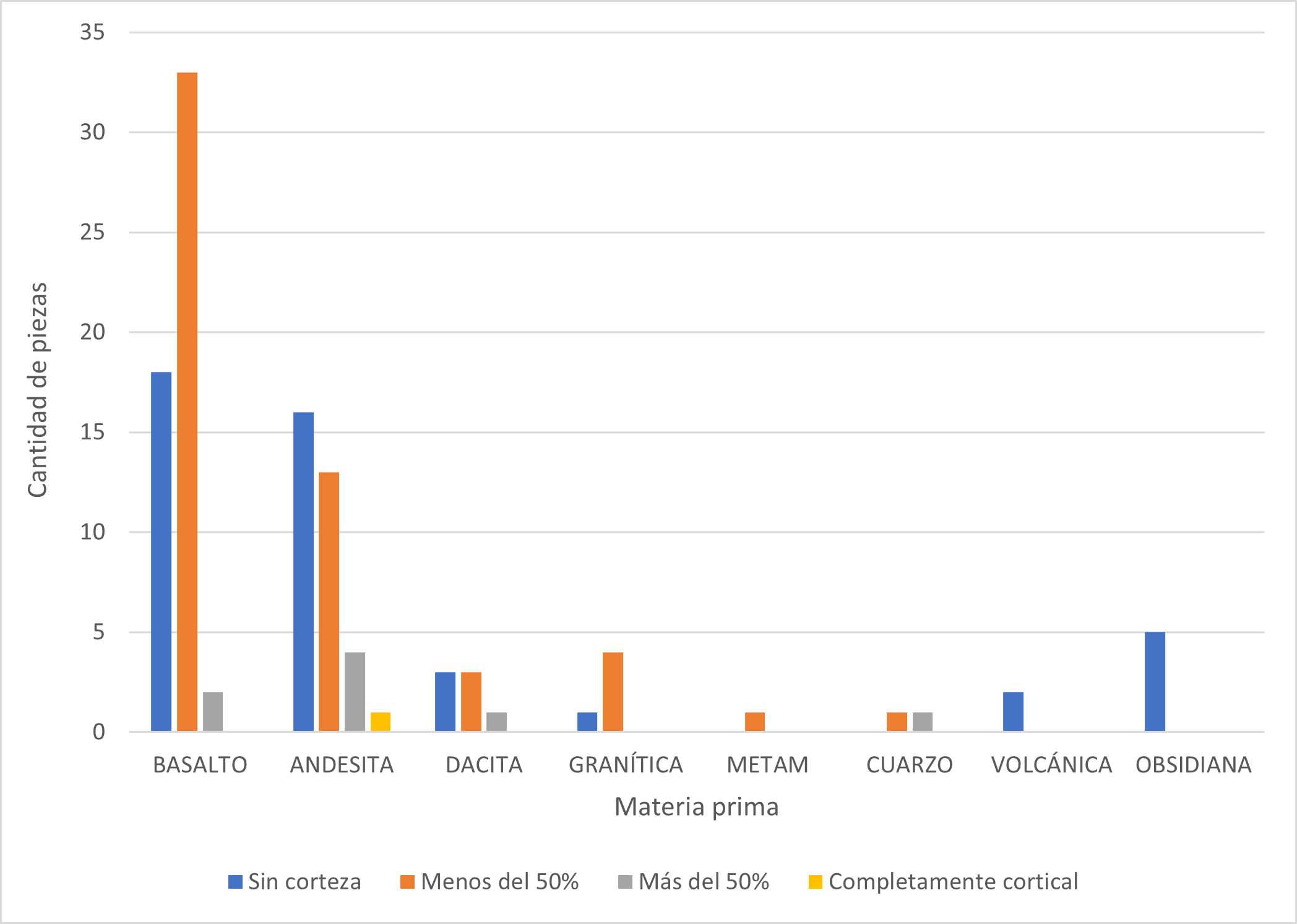 Excluyendo la obsidiana, el resto de los ANF suman 104 piezas. El 78% de ellas solo posee un filo natural potencialmente utilizable, en tanto que el 16% incluye dos filos, un 5% tres filos y una única pieza contiene cuatro filos, lo que totaliza 134 aristas. De estas, el 36% presenta rastros complementarios. Asimismo, la mayoría de las piezas presentan corteza, con predominio de aquellas donde menos de la mitad de la cara dorsal está recubierta (Figura 3).