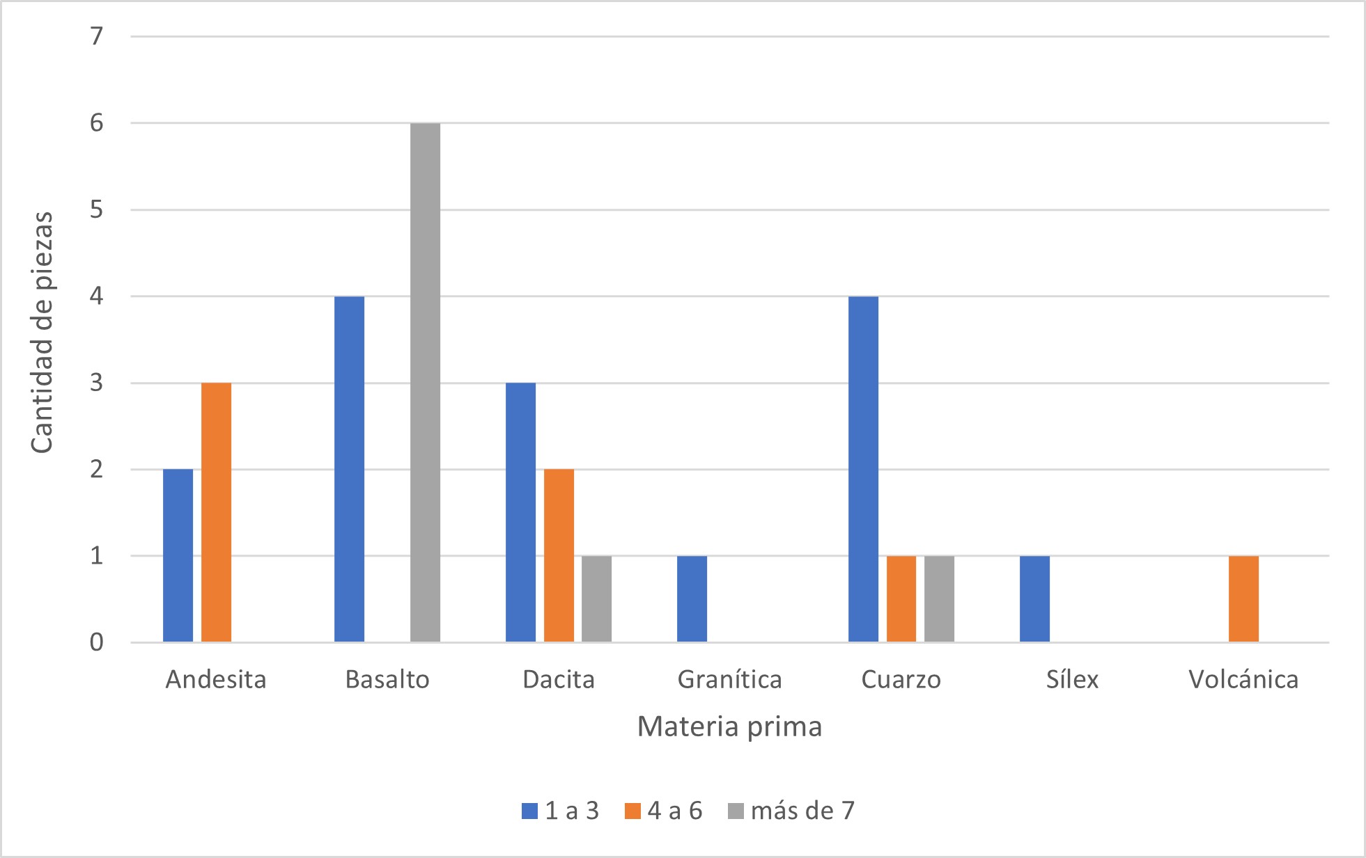 Una diferencia notable respecto de los valores anteriores es que, entre los ANF, la relación cambia sustancialmente y las materias primas más frecuentes son el basalto, la andesita y la dacita, sucedidas por la obsidiana, el granito, el cuarzo, roca volcánica indeterminada y roca metamórfica indeterminada. Entre la clase de los núcleos no se registraron ejemplares de obsidiana, pero sí de basalto, dacita, cuarzo, andesita, granito, sílex y roca volcánica indeterminada.