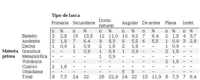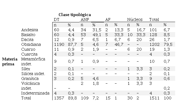 Al ordenar los porcentajes de materias primas por clase tipológica se observan algunas particularidades (Tabla 1). Por un lado, entre los DT destaca la abundancia de obsidiana, que además explica la preponderancia de esta clase tipológica por sobre las otras. Le siguen, en menor cantidad y orden decreciente, la andesita, el basalto, la dacita, el cuarzo y rocas metamórficas indeterminadas. En menor frecuencia se reconocieron desechos de cuarcita, granito, sílex y roca silícea indeterminada.