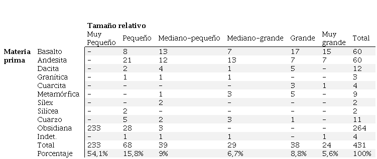 En cuanto a la alta representación de la obsidiana por encima del resto de las materias primas empleadas, esto se explica por la cantidad de DT, que eleva considerablemente la sumatoria total. El hecho de que la gran mayoría de los numerosos DT sean de tamaño relativo muy pequeño no permite considerar que sean aprovechables como formas base y, por consiguiente, se descarta la posibilidad de que la mayor representación de obsidiana indique una práctica de acumulación como anticipación al momento en que fuera requerida.