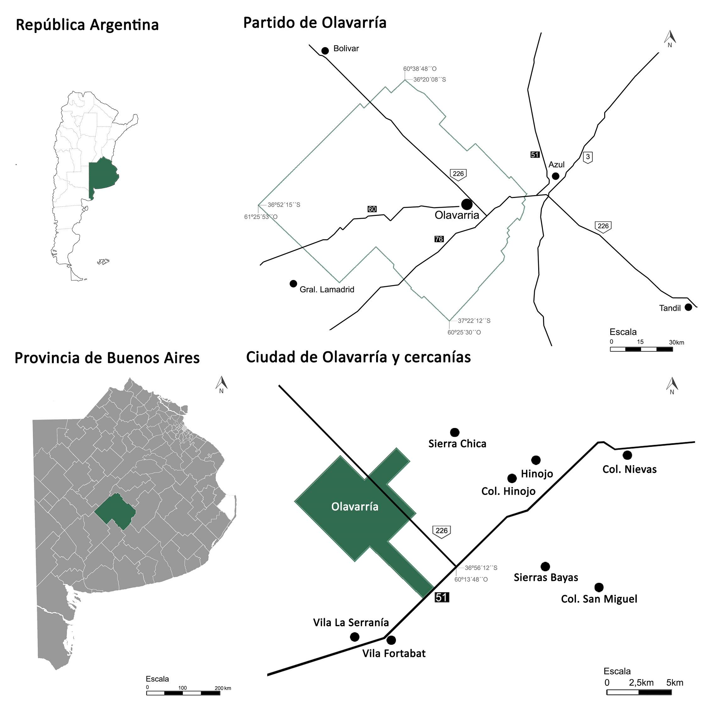La ciudad de Olavarría se ubica en el este del partido homónimo, del cual es cabecera. Este está ubicado en el centro geográfico de la provincia de Buenos Aires, República Argentina (Figura 1). Hacia 2010, contaba con 112.534 habitantes (Instituto Nacional de Estadística y Censos –INDEC–, 2012); los datos provisionales del CENSO Nacional 2022 (INDEC, 2023) arrojan que, en la actualidad, cuenta con 126.328 habitantes. La ciudad ocupa una superficie de aproximadamente 24 km.. Con 89.712 habitantes (INDEC, 2012), concentra el 80,3% de la población del partido y se constituye en una ciudad intermedia menor (entre 50.000 y 399.999 habitantes; Di Nucci y Linares, 2016).