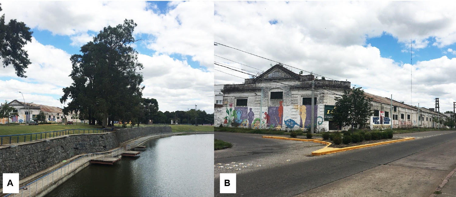 A pocos metros se ubicaba el Molino “La Clara”, el primer molino harinero de Olavarría, fundado en 1881, que se alimentaba de la energía hidráulica proporcionada por el arroyo Tapalqué. Con posterioridad funcionó, en esas mismas instalaciones, una usina de electricidad y, finalmente, una fábrica de tejados de cerámicos. Debido a que al cesar la actividad fabril se arrojó al arroyo buena parte de los desperdicios, los arqueólogos suelen encontrar en sus excavaciones en el lugar gran cantidad de piezas de cerámica (Julio Merlo, entrevista, 18 de febrero de 2020, citado en Cantar, 2021). El edificio del Molino “La Clara” actualmente ocupa todo el frente de una manzana y conserva la parte trasera de los galpones, que originalmente se extendían hasta la margen del arroyo. Sobre esta última, detrás de los gaviones, se encuentra el tajamar usado para mover la maquinaria del molino, aunque esto no se puede observar a simple vista (Figura 2).