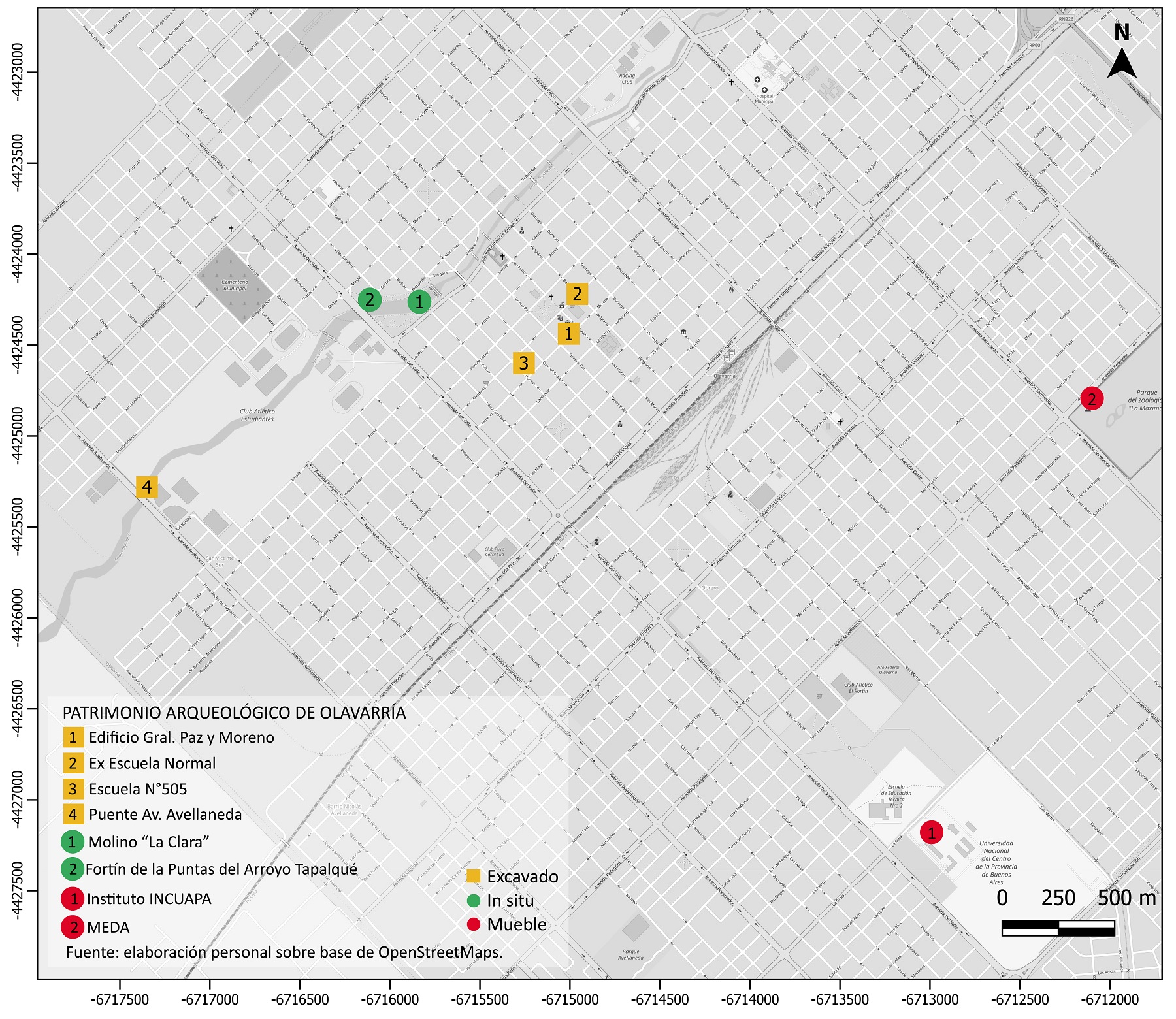 En la Figura 3 se puede observar la distribución geográfica del patrimonio arqueológico in situ que se ubica en el centro histórico de la ciudad, representado por el Molino La Clara y el sector contiguo a él, que correspondería al Fortín de las Puntas del arroyo Tapalqué. En lo que respecta al patrimonio investigado se incorporaron, en el centro de la ciudad, áreas que han sido excavadas en contexto de rescates efectuados por los grupos de Arqueología Histórica de la UNICEN. También se indican las áreas de depósitos de bienes arqueológicos muebles de la ciudad: el depósito del INCUAPA (UNICEN) y el MEDA.