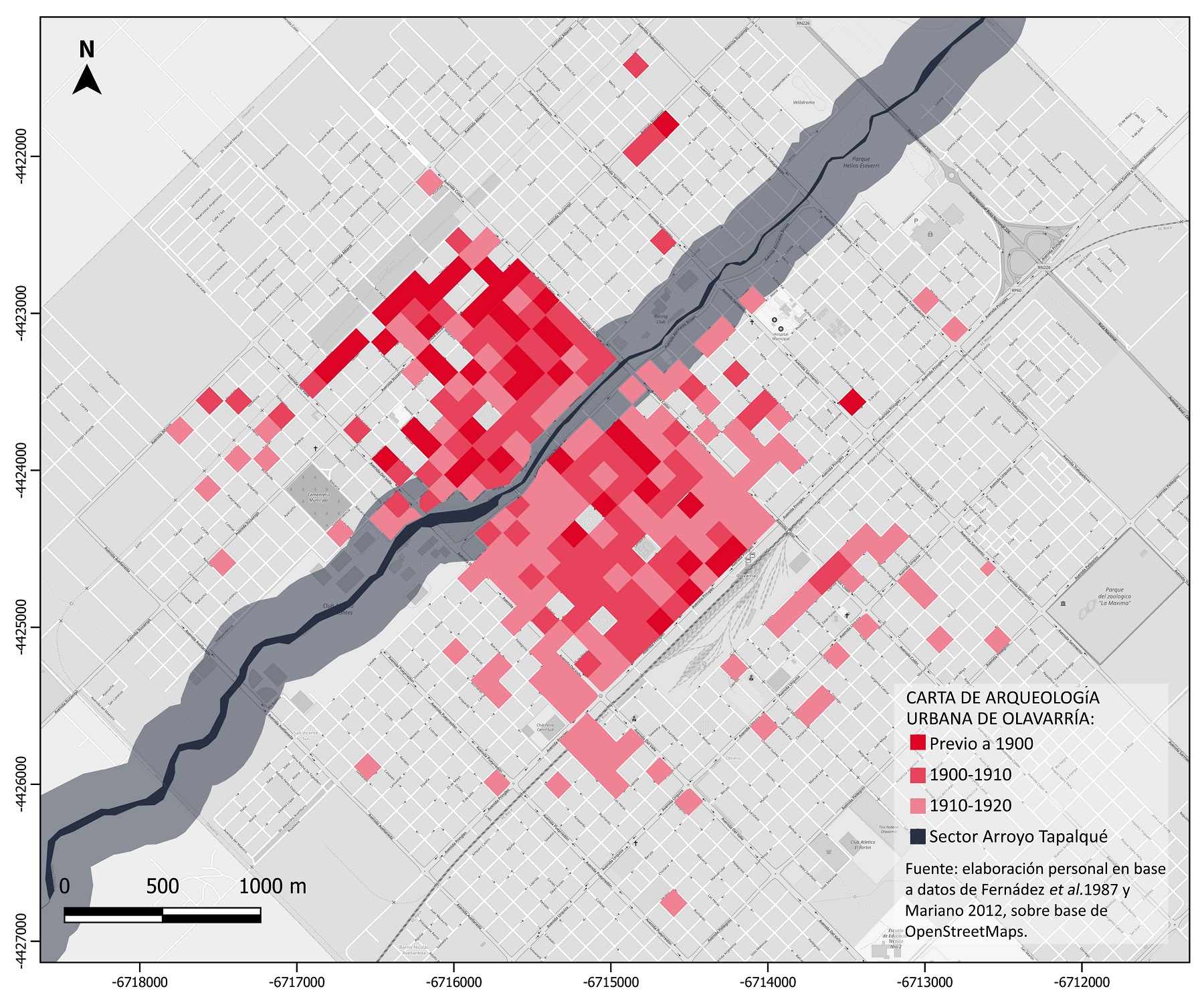 En este sentido, tomando como premisa que, para la normativa nacional, todo bien que tenga una antigüedad mayor a 100 años es considerado patrimonio arqueológico (conforme con la Ley Nº 25.743 y su Decreto Reglamentario Nº 1022), en la Figura 4 se marcan aquellas parcelas de la trama urbana que se han construido antes de 1920 según Fernández et al. (1987). Este estudio, denominado Geografía Urbana de Olavarría (Fernández et al., 1987) fue realizado en 1966 y actualizado en 1987 por el equipo de Geografía Urbana del Instituto de Investigaciones Antropológicas de Olavarría (IIAO), dependiente de la Municipalidad de Olavarría. En él se estudió a la ciudad y al partido, su ubicación geográfica en el contexto de la fundación, las funciones urbanas (i.e., la distribución del comercio y el área residencial y su caracterización), la estructura de la población y sus áreas de influencia en la región. Si bien esta investigación no ahonda en el patrimonio de la ciudad, resulta interesante en tanto presenta información con un corte temporal específico, que permite contextualizar en tiempo y espacio el patrimonio cultural, en lo relacionado con la configuración urbana y la expansión de su ejido en los decenios que van desde 1900 hasta 1980. Además de las parcelas detalladas, se incluyen todas las barrancas y el curso del arroyo Tapalqué, ya que es un espacio potencial para el descubrimiento de restos arqueológicos y paleontológicos. En este sentido, Mariano (2012, p. 189) plantea un área de “250 metros que se extienden a cada lado de las márgenes del Tapalqué”, considerando que esta “no ha sido explorada arqueológicamente en su totalidad y presenta un alto potencial de contener materiales o evidencias culturales in situ”. Si bien en el trabajo citado la autora lo plantea como un buffer, un posterior análisis de este estudio a la luz del trabajo aquí expuesto podría considerar estas zonas como áreas de potencialidad ya que, en sentido estricto, el arroyo Tapalqué no se constituiría como un área núcleo (con su consecuente buffer), sino que todo el sector, por las lógicas de uso del territorio previas a las constitución de las ciudades, se presenta como una zona de potencialidad en su totalidad. Una vez identificados sitios arqueológicos en el sector, serían factibles de ser zonificados en un área núcleo y su correspondiente área de amortiguamiento.