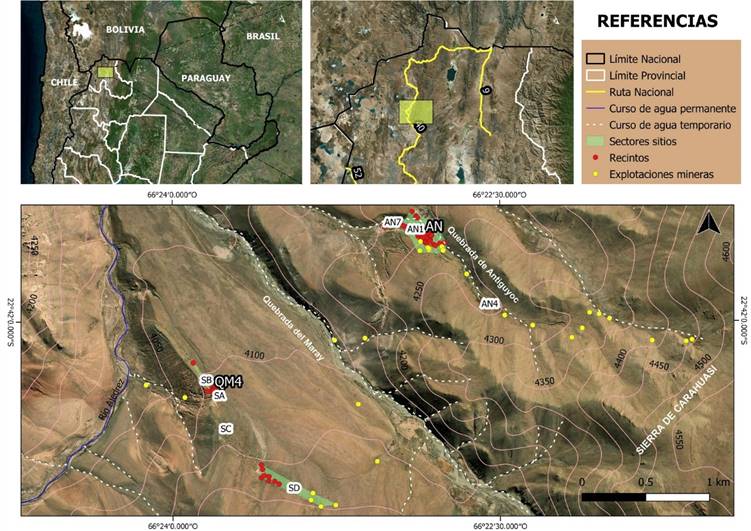 A 1000 m en línea recta de la quebrada de Antiguyoc, y en forma paralela, se encuentra la Quebrada del Maray (QM). Sobre el sector superior de la terraza izquierda registramos evidencias arqueológicas caracterizadas principalmente por arquitectura en muy buen estado de conservación y remanentes de actividades mineras que agrupamos bajo la denominación de Quebrada del Maray 4 (en adelante QM4; Figura 1). El sitio fue sectorizado según características de las construcciones y su distribución espacial. El Sector A (SA; Figura 2B) consta de tres CA, dentro de los cuales destaca el N° 1, consistente en un polígono irregular delimitado por muros que circunscriben un espacio de 75 m × 55 m en sus lados más largos, con numerosos recintos en su interior. Uno de estos recintos, denominado Patio 2 (P2), es el que presenta mayor superficie. A partir de la articulación entre registros arqueológicos y fuentes escritas inéditas, pudimos determinar que se trata de un espacio que fue utilizado como cancha para matanza de ganado (Giusta y Angiorama, 2023). Hacia el oeste y noroeste de este sector se encuentran once CA y tres recintos aislados que fueron agrupados dentro del Sector B (SB). Estos se disponen espaciados irregularmente y de manera alineada en sentido noroeste-sureste a lo largo de 260 m. El Sector C (SC), ubicado a 275 m hacia el sur del SA, está integrado por un CA y un recinto aislado, distanciados entre sí por 70 m. El Sector D (SD) comienza a una distancia de 400 m hacia el sureste del sector anterior, y en él se disponen de manera dispersa siete CA y un recinto aislado, a lo largo de 200 m. Todas las construcciones se encuentran próximas a evidencias de laboreos mineros (pozos, trincheras, desmontes y plataformas), en especial aquellas ubicadas en los sectores B, C y D. A diferencia de lo que sucede en AN, no se observaron piques o socavones para extracción de oro en veta, ya que las tareas de minería se habrían restringido a la extracción y lavado de sedimentos auríferos.