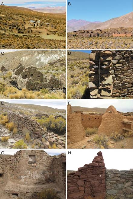 La arquitectura predominante de ambos sitios está caracterizada, básicamente, por construcciones con muros en piedra con mortero[2] de barro, de aparejos rústicos ejecutados mediante doble hilera de piedras (Figuras 2C y 2D). Algunas variaciones tienen que ver con la confección de muros en “pirca seca” (sin mortero), presentes en espacios que no estuvieron techados (Figura 2E), y por la utilización de adobes (Figura 2F).
