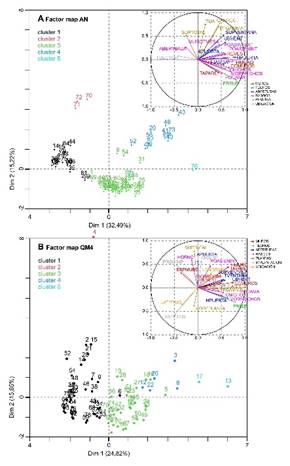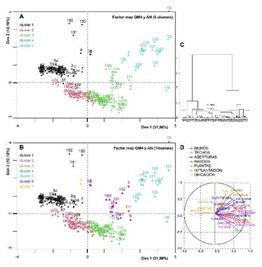 En este caso también se determinaron de manera interactiva cinco clústeres y las dos primeras dimensiones alcanzan a registrar el 47,71% de la varianza. Nuevamente el valor no llega a superar la mitad de la variabilidad; la cantidad de variables sigue siendo importante (23), pero la atomización de las aglomeraciones resulta más evidente en los resultados respecto de QM4. En la Tabla 3 volcamos los resultados correspondientes al sitio AN. El primer aspecto a destacar es que las principales variables que influyen en los agrupamientos son las mismas que para QM4. Otro aspecto similar es que aquí también se observan dos clústeres (1 y 3) que reúnen la mayoría de los casos (casi el 80%), más un tercero (clúster 4) que incluye casi un 15% de los casos (Figura 3A).
