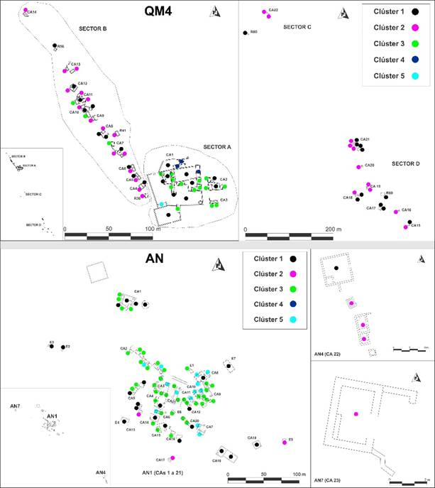 Por otra parte, fue posible determinar que las variables que tienen que ver con la localización (ubicación, tipo de sector, orientación) o los modos de organización espacial no presentaron una marcada incidencia en la variabilidad. Por ello decidimos analizar la distribución en los sitios de las conglomeraciones resultantes y representarla de manera gráfica en los correspondientes planos (Figura 5). Como habíamos señalado, el primer clúster resultante del procesamiento unificado agrupa 55 casos, de los cuales 32 se ubican en QM4 y 23 en AN; el segundo reúne 35 casos, 27 de QM4 y 8 de AN; el tercero agrupa 57 casos, 17 de QM4 y 40 de AN; el cuarto, tres casos, todos de QM4, y el quinto está integrado por 14 casos, solo uno de QM4 y 13 de AN. Como puede notarse, en el clúster 1 se observa un cierto equilibrio en la distribución entre ambos asentamientos; el clúster 2 contiene mayoría de construcciones ubicadas en QM4; los clústeres 3 y 5 incluyen una mayor cantidad de espacios ubicados en AN; y el clúster 4 reúne todos espacios de QM4.