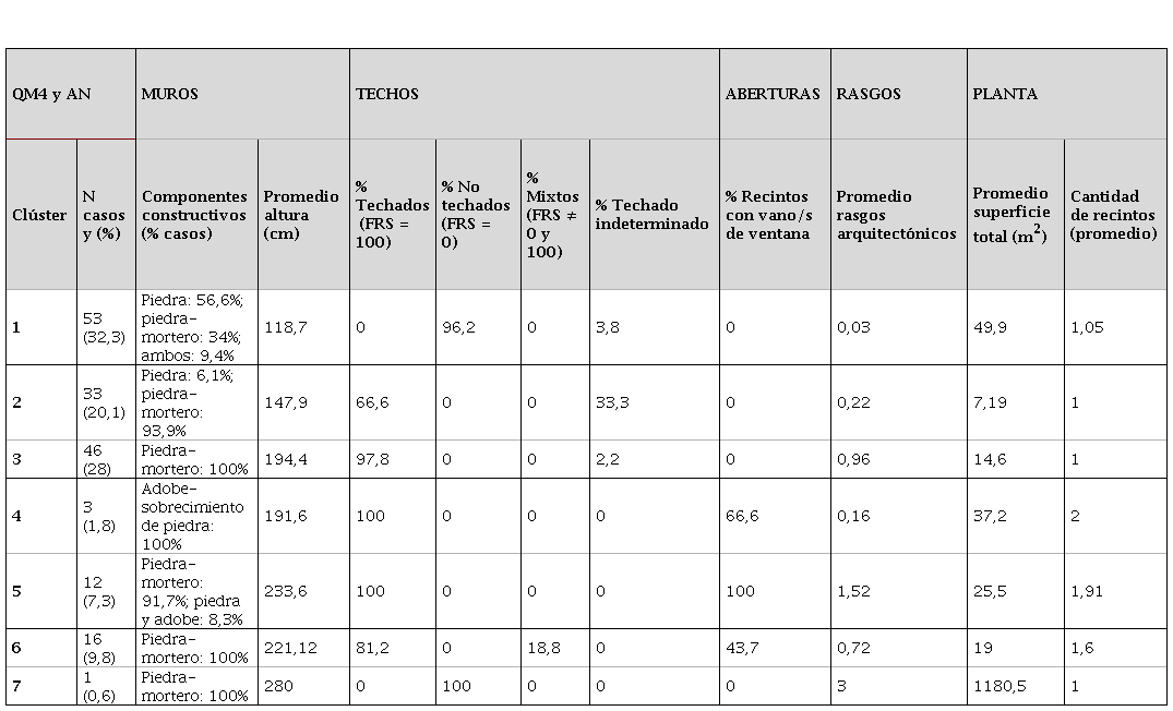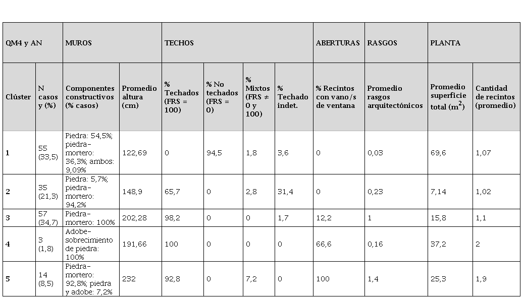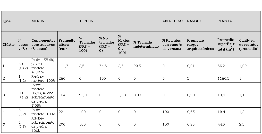 Los clústeres 2, 4 y 5 agrupan el restante 10% de los casos de QM4. El clúster 2 contiene un único caso, el espacio que mencionamos en la descripción de los sitios interpretado como una cancha de matanza de ganado (recinto P2). Se trata de un ámbito no techado pero que se diferencia de los casos incluidos en el clúster 1 porque presenta amplias dimensiones y muros que alcanzan casi 3 m de altura. El clúster 4 contiene cinco casos que se diferencian del clúster 3 por la presencia de ventanas, muros en promedio más altos, superficies más amplias y algunos casos de unidades arquitectónicas compuestas (dos recintos). Por último, el clúster 5 incluye dos unidades arquitectónicas compuestas que poseen muros de adobe con sobrecimiento de piedra, ventanas y amplias superficies (casi 45 m. en promedio).