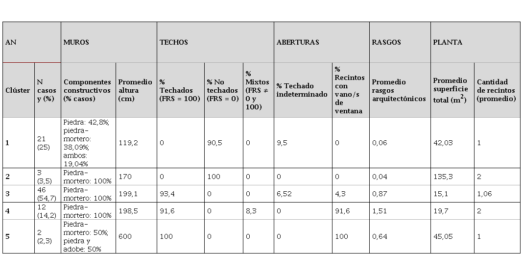 El clúster 1 agrupa espacios construidos que casi en su totalidad no estuvieron techados (FRS = 0), levantados con muros de piedra, de piedra y barro o una combinación de ambas técnicas, hasta alturas que no superan 120 cm en promedio. Se trata de unidades arquitectónicas simples (un recinto) cuyas superficies promedian los 42 m.. El clúster 3, por el contrario, agrupa construcciones que estuvieron techadas (FRS = 100), todas construidas con muros de piedra-argamasa cuyas alturas promedian casi 200 cm. También son unidades arquitectónicas simples, pero sus superficies rondan los 15 m..