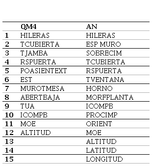 En el grupo “muros” se consideraron las siguientes variables: componentes constructivos principales (CCMUROS), espesor (ESPMUROS), altura (HMUROS); cantidad de hileras (HILERAS), tipo de aparejo predominante (TAPARE), tipo de sobrecimiento (SOBRECIM), y presencia/ausencia de revestimiento (REVEST). En el grupo “techos” se consideraron el tipo de cubierta (TCUBIERTA) y el porcentaje de superficie que estuvo techada, denominado por nosotros como factor de relación superficial (FRSUP, siendo 100 una superficie completamente cubierta y 0 una completamente descubierta, con valores intermedios para los casos “mixtos”). Con respecto a las aberturas, para las puertas se consideraron su altura (HPUERTA), ancho (APUERTA), tipo de jambas (TJAMBAS, rectas o con derrame) y resolución superior (RSUP, dintel, arco o falso arco); para las ventanas, ubicación (UBVENT), tipo (TVENTANA) y superficie (SUPVENTANA); y por último, presencia/ausencia de aberturas bajas (ABERTBAJA, aquellas ubicadas a ras del suelo). En cuanto a rasgos arquitectónicos vinculados al arreglo interno y externo, se consideraron elementos que se registraron con mayor frecuencia, tanto en los sitios analizados en esta ocasión como en otros contemporáneos del área de estudio: cantidad de poyos tipo cama (POCAMA), de poyos tipo asiento internos y externos (POASIENINT, POASINTEXT), de nichos (CNICHOS), de estantes o repisas (EST), y de muros tipo mesa (MUROTMESA); la morfología de los nichos (MORFNICHOS), y la presencia/ausencia de hornos u otras estructuras (HORNO). En el grupo “plantas” se tuvieron en cuenta su morfología (MORFPLANTA), la superficie total (SUPTOTAL), el tipo de unidad arquitectónica (TUA, definida sobre la base de Giusta, 2020), la cantidad de recintos que componen la unidad arquitectónica (CANREC), los niveles de profundidad (PFGAMMA)[3] y el índice de complejidad B (ICOMPB),[4] ambos de acuerdo con los análisis gamma (Hillier y Hanson, 1984; Blanton, 1994) realizados previamente (Giusta, 2020). En el grupo “implantación” se consideraron la variable denominada procedimiento de implantación (PROCIMP, para indicar si se trata de una construcción nuclear –inicial– o producto de una adición a otra preexistente) y la orientación de su ingreso principal, expresada en grados con respecto al norte magnético (ORIENT). El grupo “orden” está integrado por una única variable, el modo de organización espacial (MOE,sensuChing, 1995), el cual vincula al espacio construido con el conjunto arquitectónico en el que se encuentra; mientras que el grupo “emplazamiento” también se compone de una sola variable, el tipo de sector (TSECTOR), que en este caso vincula a la construcción con las características del asentamiento en general (aglomerado, semiaglomerado o disperso). Por último, el grupo “ubicación” contiene las variables que permiten la localización exacta de cada unidad de análisis, proporcionadas por el GPS: latitud (LAT), longitud (LONG) y altitud (ALT). Una vez establecidas las variables de análisis, se procedió a la construcción de dos matrices de trabajo, una para cada sitio analizado. En el caso de las variables cualitativas, fueron transformadas en variables cuantitativas asignando valores ordinales a los rasgos considerados (valores de las variables) para cada una de ellas.