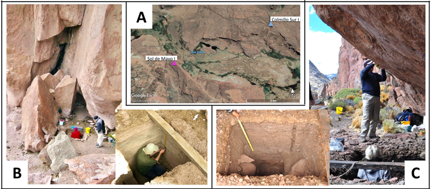 Los sitios son Colmillo Sur I y Sol de Mayo I. Ambos son aleros rocosos localizados a una distancia de aproximadamente 5 km entre sí, se encuentran cercanos al río Ghio y habrían tenido acceso a recursos fundamentales, como vegetales, animales y materia prima lítica. La oferta de reparo, su cercanía a fuentes de agua y leña, la disponibilidad y accesibilidad a recursos para la subsistencia y la existencia de instalaciones y/o materiales abandonados de ocupaciones previas son factores que se mantienen similares en ambos sitios y que probablemente generaron atractivo para su reocupación (Elston, 1992; Schlanger, 1992; Zedeño, 2008). Aún no sabemos en qué grado el acceso a alguno de ellos pudo haber representado una opción más o menos atractiva por sobre la otra para la ocupación y circulación de los grupos en esta zona (Zedeño, 2008). Explorar similitudes y diferencias entre estos dos sitios nos permitirá ahondar en su vínculo y comprender hasta qué punto estos factores influyeron en la persistencia ocupacional. Queremos saber si esta derivaría del carácter con que fueron ocupados a lo largo del tiempo (Mengoni Goñalons et al., 2009b, 2013; Fernández, 2013).