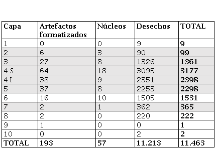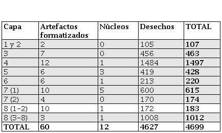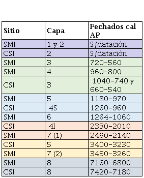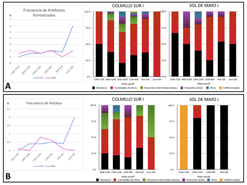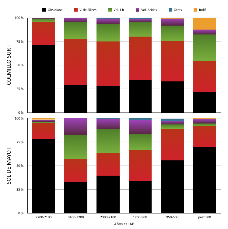 Temporalmente, lo destacable es la continuidad en el carácter de las ocupaciones de cada sitio, que se mantiene similar a lo largo de la mayor parte de su historia ocupacional pero diferente entre cada uno. Encontramos un único momento en el cual hay una coincidencia en ambos sitios, que es en las etapas iniciales de ocupación de cada uno, datadas en ca. 7400 años cal AP. Allí, en ambos encontramos un amplio dominio del uso de obsidiana, seguida por las variedades de sílices, únicas dos materias primas en que se recuperaron artefactos formatizados, y también una muy baja frecuencia de recursos locales y ausencia de núcleos. Todo esto nos indica similitud en el carácter de sus ocupaciones, que probablemente fueron las más breves y durante las cuales se realizaron únicamente actividades asociadas al proceso final de manufactura y/o reactivación de artefactos de los mejores recursos.