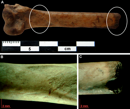 En P-QB C2 dos especímenes de aves voladoras -una ulna y una diáfisis indeterminada- presentan aserrado perimetral (Figura 6), y además se registraron numerosas huellas de corte en un húmero de Leucocarbo atriceps (Figura 4A) que indican procesamiento. Entre los restos óseos de cormoranes de P-QB C3 se destaca un radio con huellas de corte y en un fragmento de húmero distal en cuya diáfisis (porción medial) se registraron huellas de corte (Figura 5A y B). Este espécimen además presenta una fractura transversal donde se observan dos modificaciones en forma de muescas opuestas, asociadas a termoalteración, que podrían indicar que se trata de un remanente de la manufactura de algún artefacto (Figura 5C). En síntesis, las modificaciones claramente antrópicas de los tres loci son escasas pero significativas, corresponden a unos pocos especímenes de cormoranes de P-QB C2 y C3, así como de Rheidae en P-QB C1 y de aves voladoras en P-QB C2.
