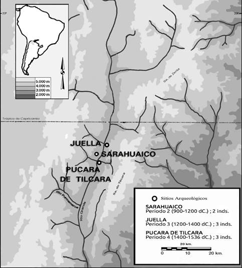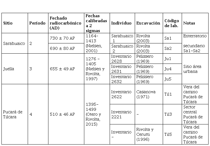 Las muestras analizadas en el presente trabajo provienen de individuos de los sitios arqueológicos Sarahuaico, Juella y Pucará de Tilcara, ubicados en la Quebrada de Humahuaca (Jujuy, Argentina; Figura 1). El primero se adscribe al Período 2 (900 - 1200 DC), el segundo al Período 3, mientras que el Pucará de Tilcara tiene continuidad desde el Período 2 hasta el Hispano-indígena (1536 - 1816 DC), aunque es en el período incaico (1400 - 1536 DC) donde se registra su mayor ocupación y al cual corresponden las muestras aquí analizadas (Tabla 1).