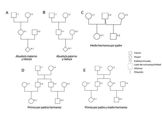 Posteriormente, se evaluó la probabilidad de diferentes relaciones de parentesco entre los individuos de cada uno de los sitios, representadas a través de pedrigrís. Para ello, se utilizó el programa Familias3 (Egeland et al., 2000; Kling et al., 2014) considerando la relación de parentesco a probar como hipótesis alternativa y la no relación como hipótesis nula. A partir de esto se calcularon las probabilidades a posteriori y de la razón de verosimilitud (Likelihood ratio: hipótesis alternativa/hipótesis nula) para cada una de las relaciones por pares. Como recomiendan Russo y colaboradores (2016), se utilizó el modelo de mutación "Extended stepwise", modelo de mutación más común para STRs (Tautz, 1993), y los valores por defecto, con dos excepciones: el número de generaciones máximas se fijó en 2 para enfatizar los pedigríes cortos, y el parámetro "Inbreeding" (endogamia) se fijó en 1,5 porque aumenta la probabilidad de relaciones endógamas. Se puso a prueba la existencia de relaciones de parentesco de primer grado (progenitores-descendencia y hermandad) y de segundo grado (abuelos-nietos; primos; medio hermanos) entre todos los individuos de un mismo sitio. En el planteo de los pedigrís se tuvieron en cuenta los linajes maternos, paternos y los haplotipos de cada individuo, así como su sexo genético (XX/XY) (Tabla 2). En este caso se tomó como umbral una probabilidad posterior de 0,8, descartando la hipótesis de parentesco propuesta para valores inferiores a este. Estos valores surgen de la transformación de la razón de verosimilitud en probabilidad posterior, es decir en una magnitud que exprese la plausibilidad de las hipótesis nulas y alternativas planteadas a la vista de los datos que se obtienen (Vidal Garcia, 2020).
