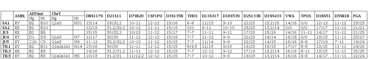 Los perfiles de ADNmt, STRs nucleares y del cromosoma Y de los individuos fueron obtenidos y analizados a nivel poblacional en Mendisco et al. (2014), Russo et al. (2018). La metodología de extracción, amplificación y determinación de STRs nucleares se encuentra detallada en dichos trabajos. Se cumplieron los criterios de autenticidad requeridos para el trabajo con ADNa. Los resultados obtenidos para cada individuo se detallan en la Tabla 2.