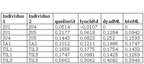 Los coeficientes de parentesco (r) entre pares de individuos se estimaron con cuatro métodos de estimación: dos de momento3 (Queller y Goodnight, 1989; Lynch y Ritland, 1999), uno de probabilidad diádica (Milligan, 2003) y otro de probabilidad triádica (Wang, 2007). Todos los cálculos se realizaron con el paquete de R Related (v1.0; Pew et al., 2015), que admite la presencia de endogamia. Al ser r un valor continuo, puede interpretarse como un coeficiente de correlación (Wang, 2014), por lo cual los valores superiores a 0,7 se definieron como altos, entre 0,7 y 0,6 como moderados, y por debajo de 0,6 como bajos (Russo et al., 2016).