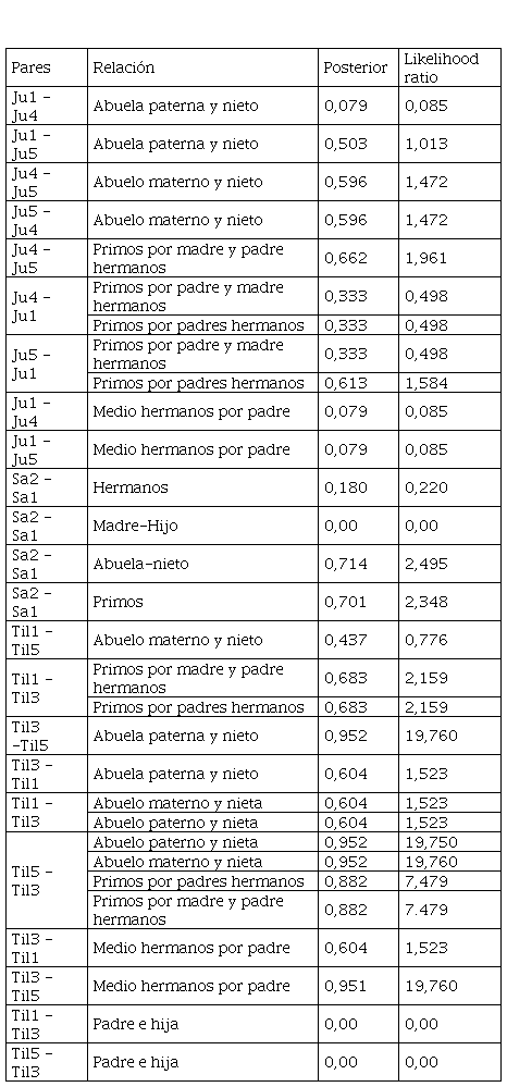 En la Tabla 4 se presentan los resultados de las probabilidades a posteriori y de la razón de verosimilitud para cada una de las relaciones de parentesco por pares testeadas. Tres de las relaciones de segundo grado testeadas entre los individuos del Pucará de Tilcara presentaron valores de probabilidad posterior superiores a 0,8.