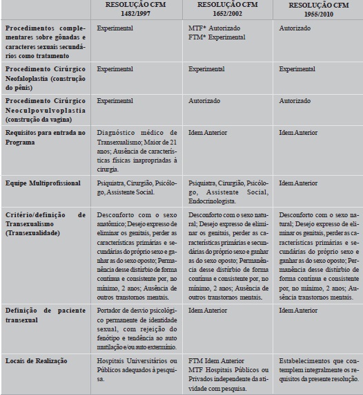 Ao observar a Tabela 1 percebe-se que não houve alterações na definição de transexualismo e em seus critérios entre a primeira e a última resolução do CFM. As portarias ministeriais que regulamentaram o processo transexualizador no SUS ora se orientaram pelas resoluções CFM, ora pela CID-10, ou não deixaram claro. Contudo, ao comprar as definições de transexualismo vê-se que, para o CFM (2010) é: "portador de desvio psicológico permanente de identidade sexual, com rejeição do fenótipo e tendência ao auto mutilação e/ou auto extermínio". Segundo o CID- 10 (OMS, 2008), "Trata-se de um desejo de viver e ser aceito enquanto pessoa do sexo oposto. Este desejo se acompanha em geral de um sentimento de mal estar ou de inadaptação por referência a seu próprio sexo anatômico e do desejo de submeter-se a uma intervenção cirúrgica ou a um tratamento hormonal a fim de tornar seu corpo tão conforme quanto possível ao sexo desejado".
