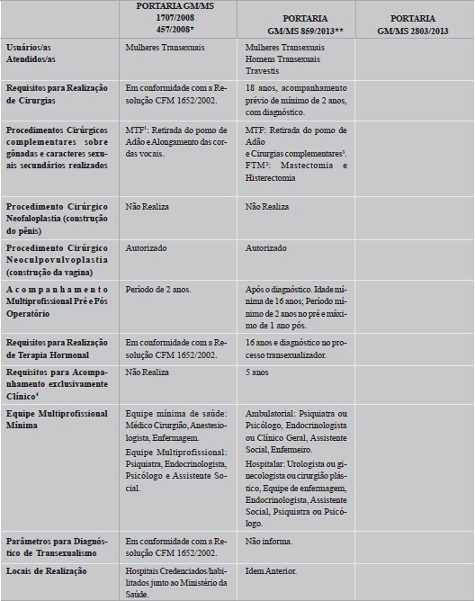 Essa portaria teve curta vigência, sendo revogada pela Portaria 1579/2013. Ainda em 2013, o Ministério da Saúde publicou a Portaria 2803/2013, em cumprimento a uma Ação Civil Pública de 13 de setembro de 2013 que determinou ao Ministério da Saúde, em um prazo de 30 dias, tomar todas as medidas necessárias à garantia da realização de todos os procedimentos médicos "para garantir a cirurgia de transgenitalização e a readequação sexual no Processo Transexualizador" nos termos da Resolução CFM nº 1.652/2012 (BRASIL, 2013a). A nova normatização ampliou as idades para todos os procedimentos: hormonioterapia de 16 para 18 anos, a realização das cirurgias de 18 para 21 anos e o acompanhamento exclusivamente clínico, inserido pela portaria anterior, teve a idade ampliada de cinco para 18 anos. A Portaria MS 2803/2013 adicionou as cirurgias de neofaloplastia e outras cirurgias (vaginectomia e neofaloplastia com implante de próteses penianas e testiculares, clitoroplastia e cirurgia de cordas vocais em pacientes em readequação para o fenótipo masculino) para homens transexuais, mantendo o caráter experimental e os critérios estabelecidos na Resolução CFM 1955/2010. Acrescentou também as cirurgias para implante de prótese mamária. A normativa incluiu as pessoas travestis, no entanto, manteve o diagnóstico como condicionante ao acesso à hormonioterapia, diagnóstico, como dito anteriormente, que não contempla as pessoas travestis, conforme Tabela 2, acima.