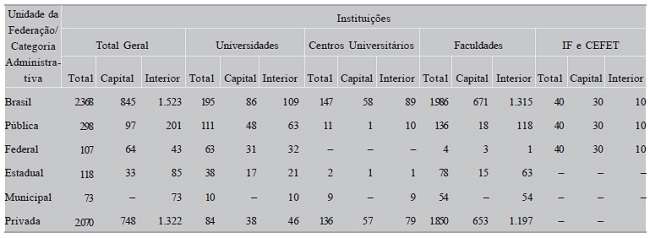 Os números acima revelam que, dentre as 2.368 IES brasileiras, 2.070 (89,68%) são privadas; constituídas nas seguintes modalidades: 84 (4,05%) são universidades, 136 (6,57%) são centros universitários e, a ampla maioria, 1.850 (89,37%) são faculdades. Quanto às 298 instituições públicas, nas três esferas de governo, verifica-se que 111 (36,91%) são universidades; 11 (3,69%) são centros universitários, 136 são faculdades (45,63%) e 40 (13,42%) são Institutos Federais (IFs) e/ou Centros Federais de Educação Tecnológica (CEFETs). Constata-se uma prevalência de instituições no interior: um total de 1.523 (64,31%) IES - 1.322 (63,86%) privadas e 201 (67,44%) públicas (BRASIL, 2015).
