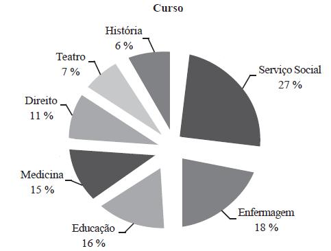 Participaram das entrevistas representantes de sete categorias profissionais, sendo cinco relacionadas às Ciências Humanas e Sociais e duas às Ciências da Saúde (Direito = 6; Educação = 9; Enfermagem = 10; História = 3; Medicina = 8; Serviço Social = 15; e Teatro = 4) de várias universidades, desde que federais ou estaduais, conforme pode ser verificado no Gráfico 1, infra).