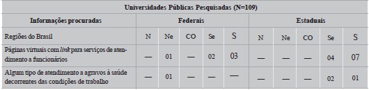 Assim, ao conversarmos com docentes por ocasião do proferimento de palestras a respeito deste tema, pudemos esboçar um quadro que, apesar de pequeno, é de tal forma contundente que se torna impossível de ignorar. O nosso primeiro passo foi pesquisar, no sítio das 109 universidades públicas brasileiras - federais e estaduais - a existência de unidades de atendimento aos docentes. Das 109 universidades pesquisadas, somente 17 possuem, em suas páginas digitais, algum tipo de link para serviços/departamentos de atendimento à saúde dos docentes ou mesmo estudos a respeito. Destas, 16 se localizam no eixo sul/sudeste, e uma no nordeste do Brasil. Somente quatro informam algum tipo de atendimento aos agravos de saúde decorrentes das condições de trabalho dos docentes. Dentre essas quatro universidades, três localizam-se no sul do país, e uma no nordeste. Somente uma é universidade federal.