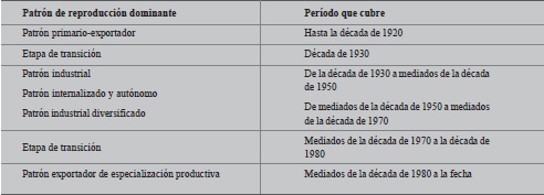 Según (OSORIO, 2005) en la región se han desarrollado fundamentalmente dos patrones de reproducción del capital: el patrón agro-minero exportador que prevaleció desde mediados del siglo XIX hasta los inicios del siglo XX, y el nuevo patrón exportador de especialización productiva que puso fin al patrón industrial entre las décadas de 1930 y 1970 y se extiende hasta la actualidad (Tabla 1).