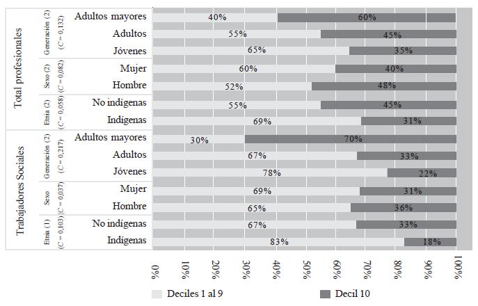 La asociación con etnia también es más intensa entre trabajadores sociales que entre profesionales en general (el coeficiente de contingencia de estos es 0,103 y el de los demás profesionales es 0,058). Los trabajadores sociales que se autodefinen como indígenas se encuentran subrepresentados en el decil superior de ingresos.