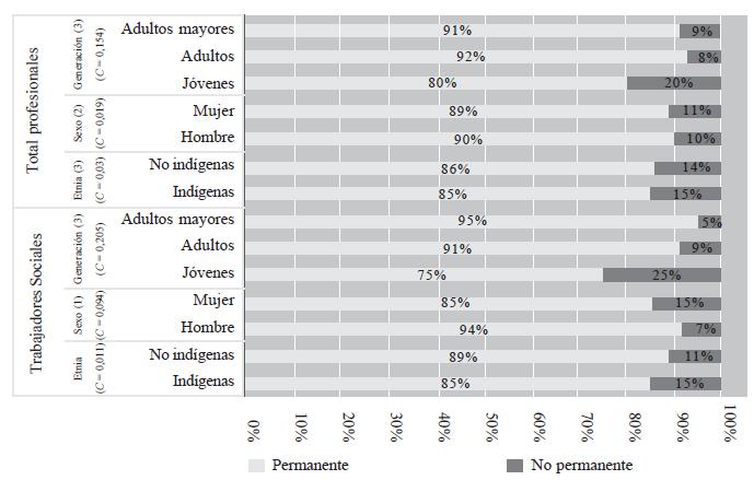 Esta última tiene una intensidad mayor. Las diferencias fluctúan entre 5% de trabajo no permanente en la categoría adultos mayores, y 25% en los jóvenes. Aunque al igual que en el caso de los ingresos, la tendencia observada en trabajadores sociales se da en la misma dirección que entre los profesionales en general, la asociación es más pronunciada en los primeros (coeficiente de contingencia de estos es de 0,205, y el de profesionales en general 0,154). En efecto, la variación entre profesionales fluctúa solo desde 8% en adultos a 20% en jóvenes.