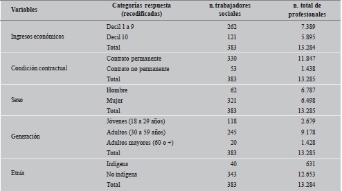 Abstract: The inequalities in the labor market among Chilean social workers were examined, analyzing whether they differ from the trends observed in other professions. Two samples of the National Socioeconomic Characterization Survey (CASEN) database from the Ministry of Social Development of Chile (2015) were used. The contingency coefficient determined the intensity of the association between economic income and contractual condition, in relation to the variables gender, generation and ethnicity. The results indicated that the proportion of social workers in the tenth part of the population with largest national income varies according to generation and ethnic group, and the proportion of those having permanent work varies according to gender and generation. In both cases, generation has the strongest association, observing more pronounced inequalities among social workers than among other professionals. There is a debate about the reproduction of inequalities in social work - associated with neoliberalism - and the ethical-political challenges that this implies.