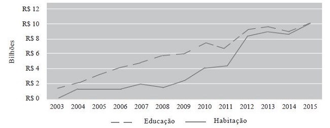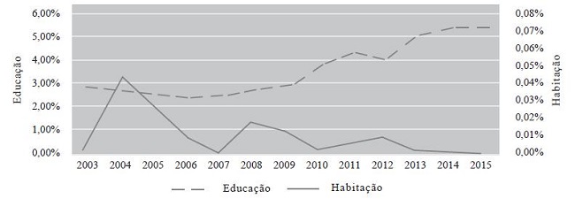 Em 2004, a habitação teve participação de 0,043% no orçamento, momento em que atinge seu ápice no período. No mesmo ano, a educação contava com 2,53% de participação, 58,8 vezes mais que a função habitação. Em 2015, a função educação chega a expressar 5,23% do orçamento, evidenciando crescimento do investimento em educação - incluídos aí os subsídios ao ensino privado. No entanto, conforme Salvador (2015), os gastos públicos com educação ainda são pequenos para efetivá-la com qualidade. Segundo o autor, “estudos apontam para a necessidade de um aporte de 10,7% do PIB, valor bem acima da proposta de 6,9% do PIB, apresentada pelo Ministério da Educação” (SALVADOR, 2015, p. 36).