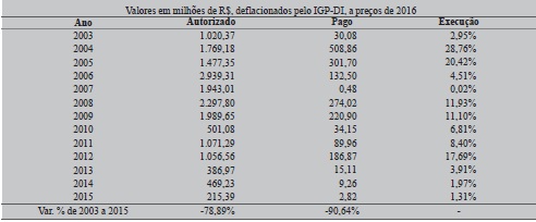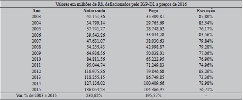 A partir da leitura da tabela 2, nota-se a baixíssima execução dos valores pagos em relação aos autorizados para a função habitação, além de grande oscilação de um ano para outro, com a média de execução de 9,21% no período 2003-2015. Já na função educação (tabela 1), a execução se mantém mais regular e com uma média de 78,19% no mesmo período. Ressalta-se ainda o montante de gastos para a função educação, bastante superior à habitação.