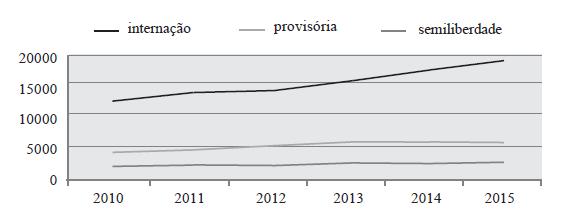 Por outro lado, segundo dados do Levantamento Anual do Sistema Nacional de Atendimento Socioeducativo (SINASE) (BRASIL, 2018), referente ao ano de 2015, revela que a medida socioeducativa de internação, que deveria ser aplicada em caráter de exceção, representa mais de 68% dentre todas as medidas aplicadas no Brasil e no conjunto de uma série histórica tem visível crescimento, conforme apresentado no Gráfico 1.