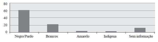 O referido documento (BRASIL, 2015) aponta, também, que no ano de 2012, o encarceramento de jovens foi 2,5 vezes maior do que o de não jovens. No que se refere a grupo étnico-racial 60,8% da população carcerária eram de negros, além do que, estes foram encarcerados 1,5% a mais que os brancos (BRASIL, 2015).