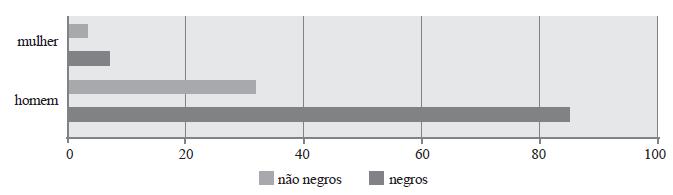 Outro dado significativo é a seletividade racial dos homicídios por armas de fogo. A taxa de homicídios por armas de fogo de jovens brancos no Brasil caiu, enquanto de jovens negros aumentou. “[...] a vitimização negra do país, que em 2003 era de 72,5%, em poucos anos duplica. Em 2012 é de 142% [...]” (WAISELFISZ, 2015, p. 101). Isso significa que morrem 2,5 vezes mais negros que brancos vitimados por arma de fogo (WAISELFISZ, 2015). O número de mortes de jovens do sexo masculino é extremamente superior ao feminino, totalizando 95% de óbitos para o sexo masculino contra apenas 5% para o feminino, dentre todas as causas de mortes por armas de fogo na população jovem em 2012 no Brasil (WAISELFISZ, 2015).
