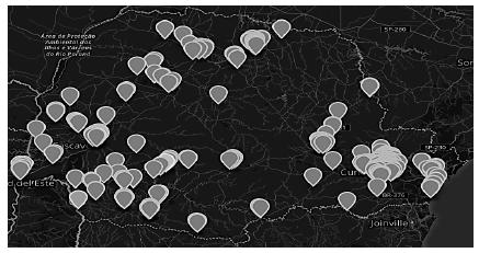 No Paraná, segundo informações disponíveis no site do Movimento Ocupa Paraná (MAPA..., [2016?]), foram ocupadas cerca de 850 escolas, 14 universidades e três Núcleos Regionais de Educação. Não obstante, as informações veiculadas no jornal impresso de maior circulação no estado apontavam os dados fornecidos pela Secretaria de Estado da Educação, informando que, dentre as 2.147 escolas da rede estadual de ensino do Paraná, apenas 590 foram ocupadas (TUDO..., 2016; MAPA..., [2016?]). A Figura 1 apresenta a concentração das escolas ocupadas no Estado.