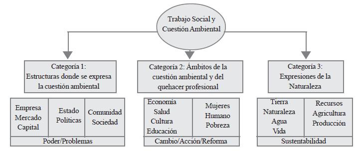 Como se observa en la Tabla 1, los conceptos más frecuentes se refieren a ámbitos de incumbencia histórica para el Trabajo Social: la naturaleza política que fundamenta la profesión y el Estado como espacio normativo de legitimación funcional (Montaño, 2012) son elementos que enmarcan las problemáticas socioambientales y los ámbitos institucionales de intervención.