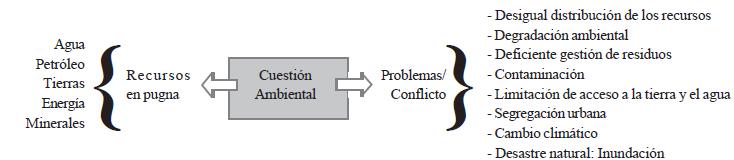En la Figura 2 se sintetizan los recursos naturales en pugna y los conflictos o problemáticas que se mencionan en las ponencias. Estos planteamientos van en absoluta concordancia con los conflictos socioambientales característicos de América Latina y son una proyección de una realidad histórica de despojo.