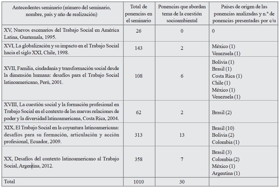 De las 1.010 ponencias presentes en los Seminarios Latinoamericanos de Escuelas de Trabajo Social en un lapso de 17 años de trayectoria disciplinar, solo 30 ponencias abordan de manera directa la cuestión socioambiental. Esto significa el 2,9 % del porcentaje total.