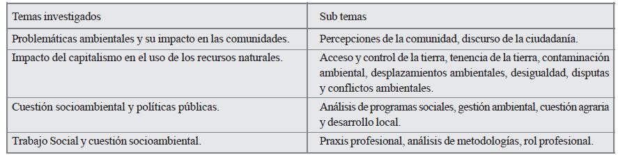 Las publicaciones se refieren a temas como Trabajo Social y desastres naturales (Cotarelo, 2015; Labra & Maltais, 2013; Miranda, 2010; Sierra, 2012; Torres, 2011); Trabajo Social y educación ambiental (Arellano, 2017; Pedraza, Vela, & Sicard, 2007; Pérez, Torres, & Vigo, 2008); Licenciamiento ambiental (Pineda, 2013); Salud y medioambiente (Giongo, Mendes, & Santos, 2015; Porto, Cunha, Pivetta, Zancan, & Freitas, 2015); Depredación ambiental, cuestión socioambiental y conflictos ecoterritoriales (Ciorino, 2013; Franceschi, 2014; Freire & Prescholdt, 2015; Jerez, 2015, 2017); y Sustentabilidad ambiental y ciudadanía (Hernández, 2010).