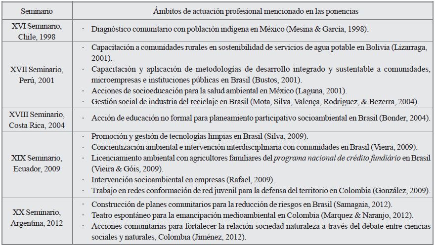 En el año 1998, una primera ponencia aborda de manera específica la problemática social y ambiental de la explotación de petróleo en Venezuela y expresa la desigual distribución de los recursos y ganancias que se producen. En los seminarios del año 2009 y 2012, se presentan ponencias que son pioneras en el abordaje de fenómenos específicos como el cambio climático, los efectos de la construcción de una mega represa en Argentina y los efectos de una inundación en Brasil a partir de la noción de desastre natural. Cada una de estas ponencias llevan por fin a los seminarios problemáticas de largo aliento en el itinerario de las demandas y movilizaciones sociales. c) Actuación profesional: