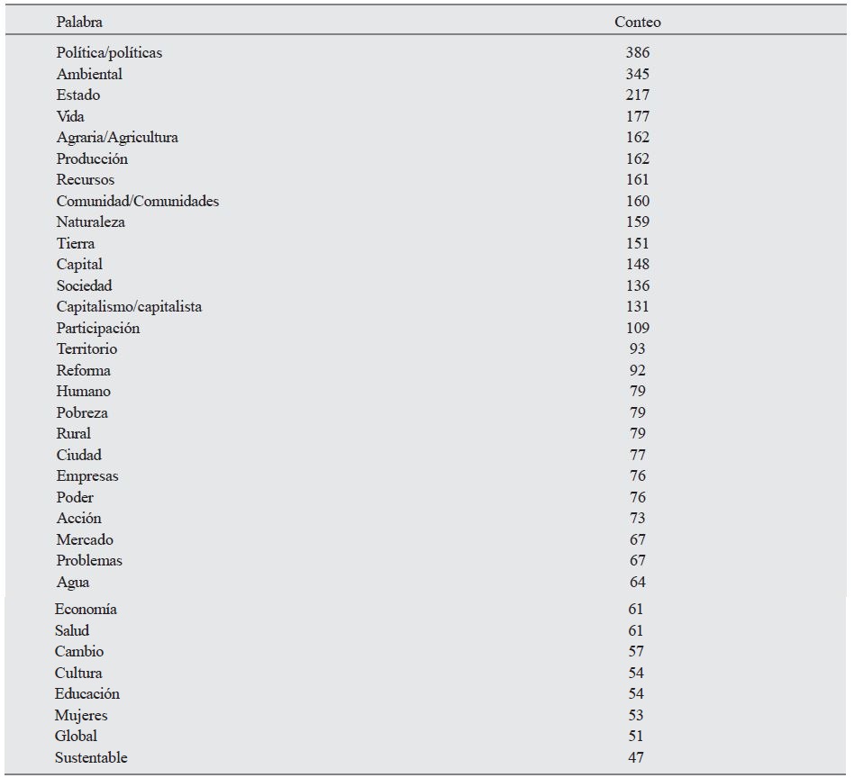 Se realizó un conteo de las palabras que aparecen con mayor frecuencia en las ponencias. En la Tabla 1, se presentan los resultados.